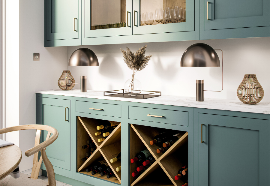 Jasper Viridian brings a rich, modern depth to the space, harmonizing perfectly with the light Oak display units and refined brass hardware. The entire design is elevated by the bold architectural framing around the fridge-freezer feature, a detail thoughtfully mirrored in the elegant dresser unit fitted with seamless bi-fold doors.